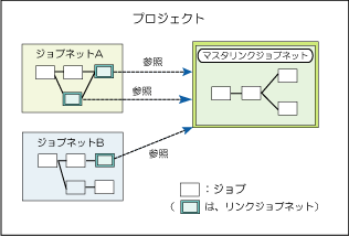 構成図において、プロジェクト内の1つのマスタリンクジョブネットを定義情報とするリンクジョブネットが、ジョブネットAには2つ登録されています。また、ジョブネットBに登録されているリンクジョブネットも同じマスタリンクジョブネットを参照しています。