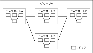 構成図において、ジョブネットAは第1階層、ジョブネットBは第2階層、ジョブネットCおよびジョブネットDは第3階層のジョブネットです。ジョブネットAは、ジョブネットBの親ジョブネット、ジョブネットBは、ジョブネットCとジョブネットDの親ジョブネットです。ジョブネットBは、ジョブネットAの子ジョブネット、ジョブネットCとジョブネットDは、ジョブネットBの子ジョブネットです。