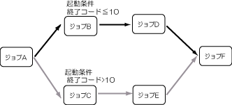 下図のように、起動条件として、ジョブAの終了コードが10以下の場合はジョブBを起動し、終了コードが10より大きい場合はジョブCを起動するといった設定ができます。
