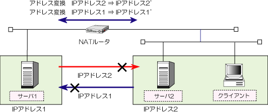IPアドレス1を持つサーバ1と、NAT環境にIPアドレス2を持つサーバ2がある構成で、NATルータのアドレス変換機能によって、NAT環境のサーバ2のIPアドレス2がサーバ1側から隠ぺいされ、サーバ1からサーバ2は、アドレス変換機能により変換されたIPアドレス2'として見えます。