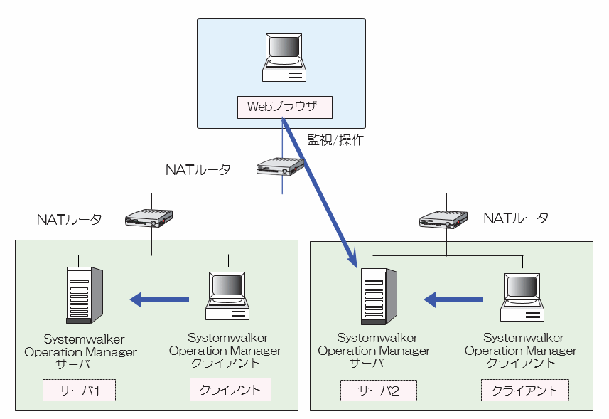 NAT環境でSystemwalker Operation Managerを使用する場合、以下の構成図のようにWebコンソールを用いて、NAT環境にあるSystemwalker Operation Managerサーバを、監視/操作することができます。