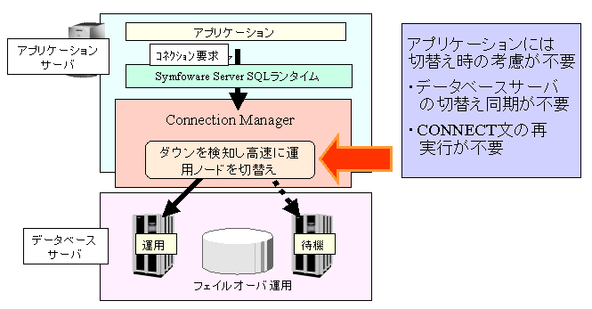 フェイルオーバ運用と組み合わせた場合の、コネクション自動切り替え機能について、以下に示します。