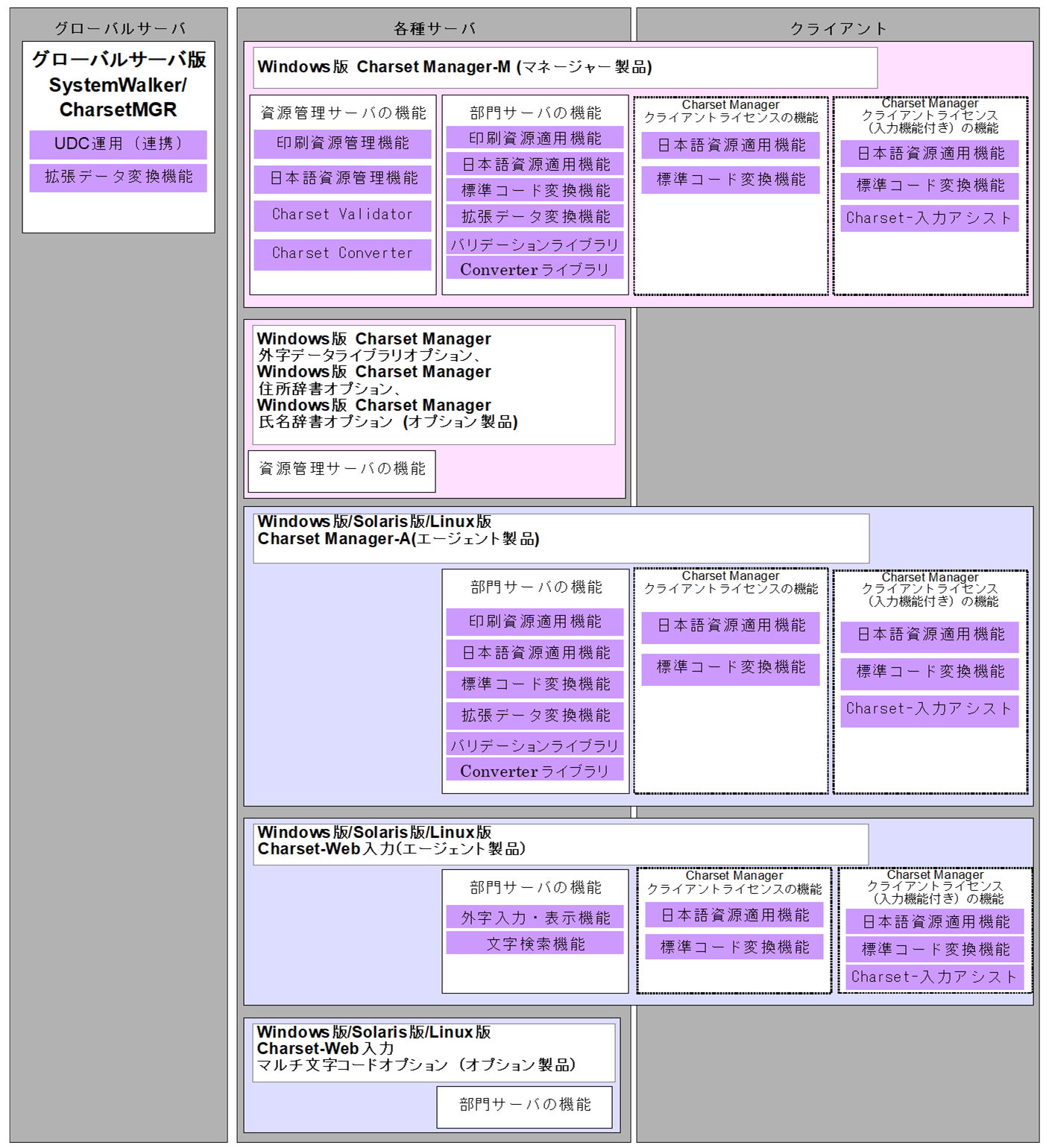 資源管理サーバ、部門サーバ、およびクライアントの機能をすべて包含している「マネージャー製品」です。印刷資源や外字を管理するための機能はCharset Manager-Mで提供しています。