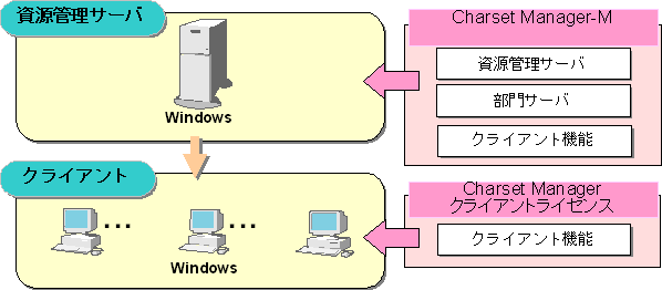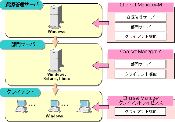 資源管理サーバにはCharset Manager-M、部門サーバにはCharset Manager-A、クライアントには各製品のクライアント機能を導入します。
