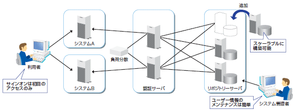 組織別に構築されたシングルサインオンシステム間での認証サーバ連携により、認証に必要なユーザー情報が通知され、別組織の業務サーバへも1回のサインオンでアクセスできます。認証サーバやユーザー情報を格納するリポジトリーサーバは、ユーザーの増大などに応じてスケーラブルな構成やリレーショナルデータベースの利用が可能です。さらに、一定時間で認証を無効にするアイドルタイムアウトや多重サインオン抑止などの機能により、適切な利用者認証、アクセス制御が可能です。