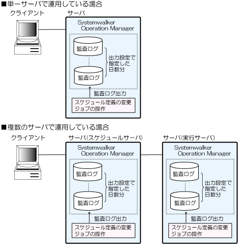 なお、Systemwalker Centric Managerの監査ログ管理機能を利用して、各サーバのログを収集し、運用管理サーバで一元管理したい場合は、監査ログ管理機能の設定変更が必要になります。“Systemwalker Centric Managerの監査ログ管理機能の設定変更”を参照して設定を変更してください。