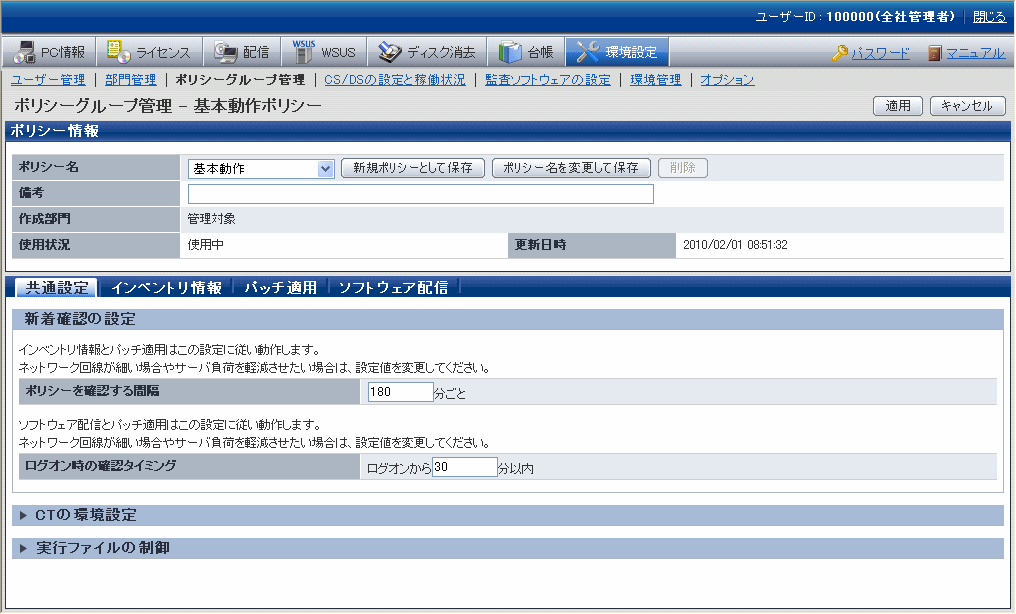 セキュリティパッチを自動で適用する間隔を設定します。また、CSからDSにセキュリティパッチを配信する間隔や、CTに新着メッセージを表示させるための設定を行います。