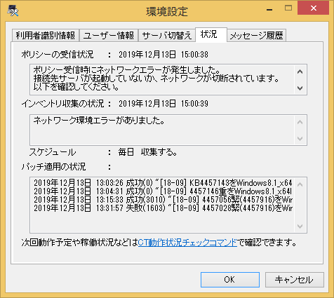 [環境設定]画面の[状況]タブにある“CT動作状況チェックコマンド”のリンクをクリックすることで、CTの動作状況を確認することができます。
