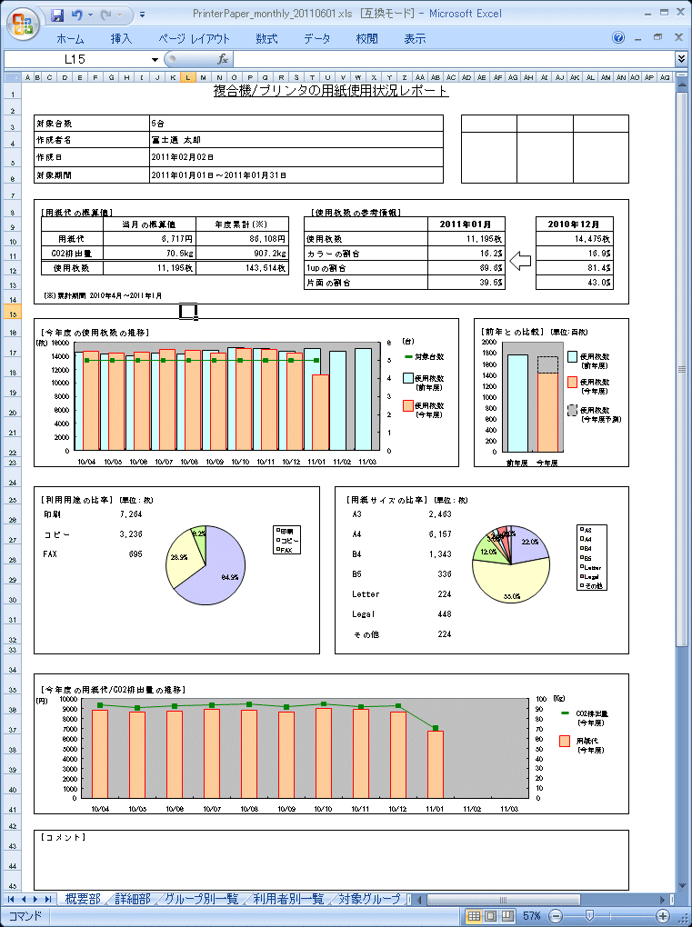 概要部 | 集計対象月に対し、使用枚数を印刷コスト・CO2排出量の観点で出力します。 |
