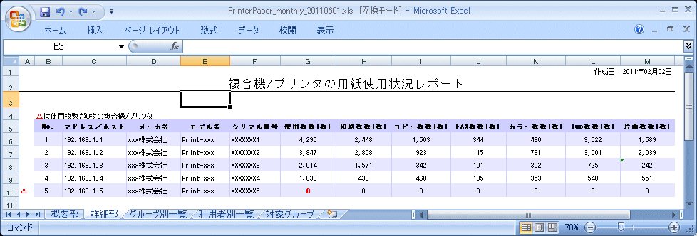 生成したレポートファイルや印刷結果のレイアウトは、使用しているMicrosoft Excelのバージョンやサービスパックによって異なる場合があります。