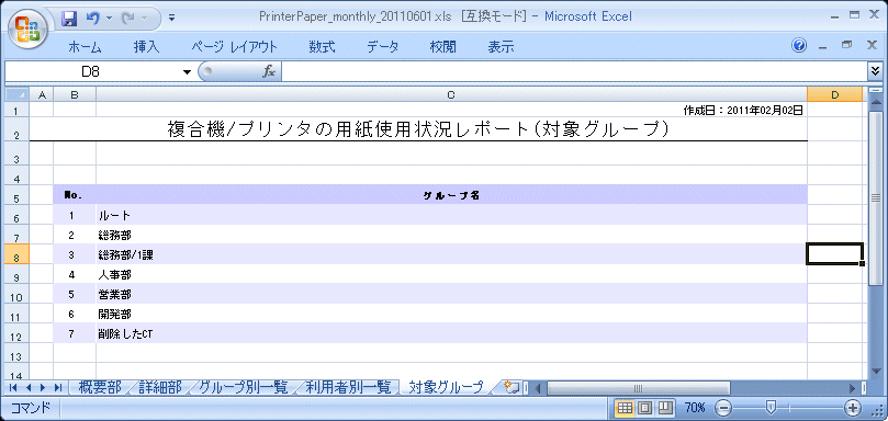 部門管理者が本レポートを出力した場合は、複合機/プリンタ台数は表示されません。また、使用枚数は自部門の用紙使用枚数を対象として表示します。