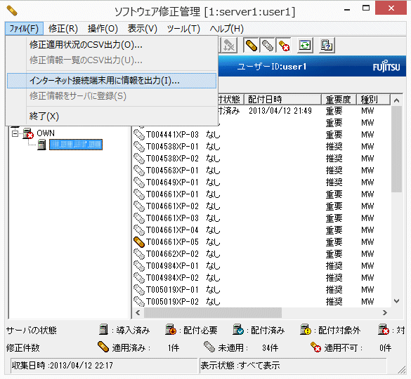 [ソフトウェア修正管理]画面でインターネット接続端末用に情報を出力するために、[ファイル]メニューの[インターネット接続端末用に情報を出力]を選択します。