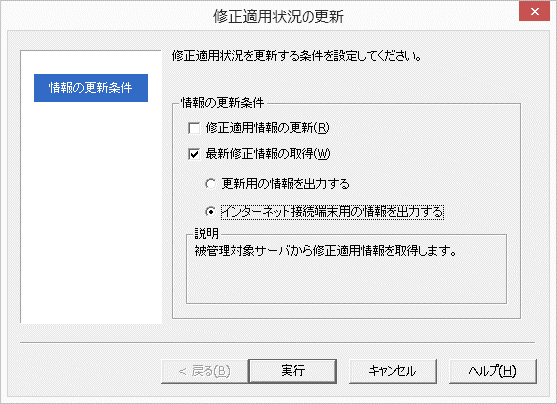 表示される[修正適用状況の更新]画面で[最新修正情報の取得]チェックボックスをONにし、[インターネット接続端末用の情報を出力する]を選択します。