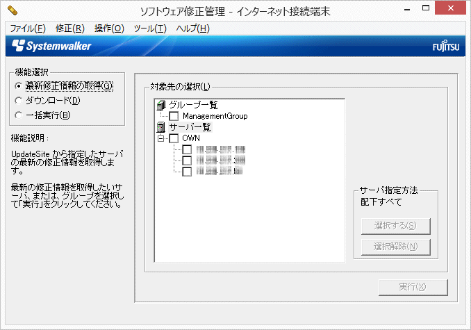 [対象先の選択]で、最新の修正情報を取得する[グループ]または[サーバ]をチェックします。
