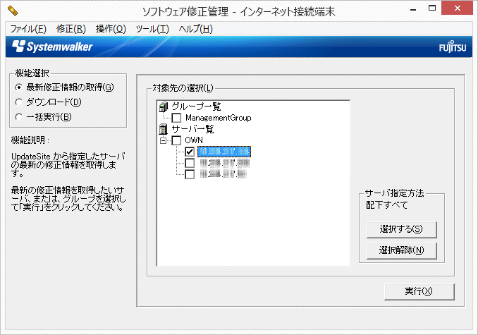 [対象先の選択]で対象先のサーバやグループを選択し、[実行]ボタンをクリックします。