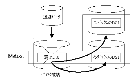 退避データを使用して表のDSIをリカバリしたあと、リカバリした表のDSIの内容から表のDSIに対して定義されているすべてのインデックスのDSIを自動的にリカバリします。ただしXML格納構造のインデックスのDSIは対象外になります。また、表のDSIに対してアクセス禁止が設定されている必要があります。