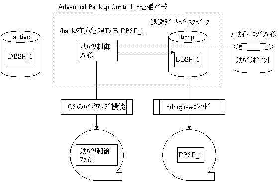 Advanced Backup Controllerの退避データとして、ミラーボリュームから切り離されたスライスである退避データベーススペースまたはバックアップシェルスクリプトにより採取されたバックアップと、リカバリ時に必要な情報が格納されたリカバリ制御ファイルの2つが、データベーススペース単位に作成されます。このとき、退避データの取得点を表すためのリカバリポイントが、アーカイブログファイルに設定されます。処理メッセージは、標準出力されます。