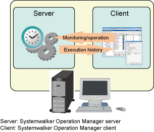Systemwalker Operation Manager consists of server functions and client functions. The server functions automatically operate jobs, and the client functions connect to the server and provide a user interface that enables definition, monitoring, and operation.