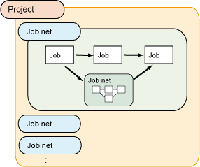 The relationship between projects, job nets, and jobs is shown below: