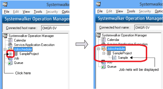 The relationship between a project and its component job nets is represented using a tree structure. Expanding Jobscheduler displays its registered projects.