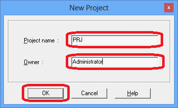 The New Project window will be displayed. Enter "PRJ" for Project name and "administrator" for Owner.