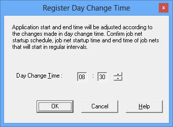 Set the day change time using the Register Day Change Time dialog box displayed. The day change time specified is applied regardless of whether it is a weekday or a holiday.