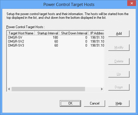 Changes the setting for the power control target hosts. Clicking the Modify button displays the Power Control Target Host Setup window.