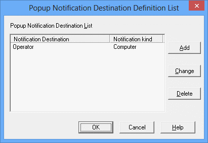 Defines a new notification destination to be added. When this button is clicked, the Popup Notification Destination Definition dialog box is displayed. Refer to the Popup Notification Destination Definition dialog box setup method provided below when adding a notification destination.