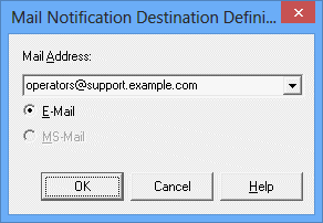 When Popup is selected as notification means, the Popup Notification Destination Definition List dialog box will appear. (If a connection is made to a server running V13.2.0 or earlier, the Popup Notification Destination Definition dialog box will be displayed.) When Mail is selected, the Mail Notification Destination Definition dialog box will appear. Specify notification destination according to the Popup Notification Destination Definition List dialog box or the Mail Notification Destination Definition dialog box shown below.