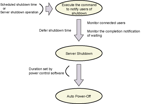 In Systemwalker Operation Manager, it is possible to monitor logged in users via the network or notify the users still being connected to a server via a network when the server is shut down. Also, the server shutdown can be delayed until the end-of-wait notification is issued. For example, issuing an end-of-wait notification command enables an automatic delay of the server shutdown based on how much delay is in the operation. In Systemwalker Operation Manager, this is called 'shutdown monitoring'. The following shows the flow of the server shutdown processing.