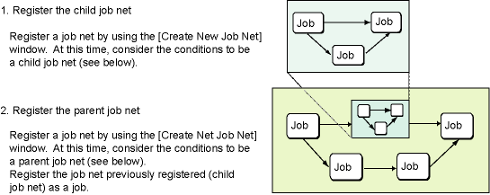 Job nets can be registered as jobs in other job nets. Registering a job net in another job net is referred to as "layering." The job net where another job net has been registered is referred to as the "parent job net," and a job net registered in the parent job net is referred to as a "child job net."