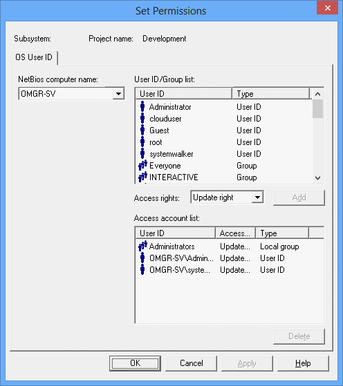 In the Set Permissions window, select a user or group that will be able to access the project, and then specify an access right (update right, change right, operation right or reference right).
