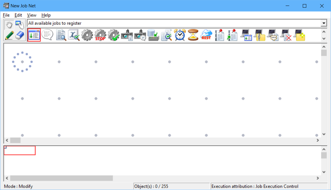 In set mode, select a job icon to be registered in the job net from the icon selection area. Then, use the mouse to click and drag an allocated job icon on the job flow display area. Child or linked job nets can also be registered by selecting the job net or linked job net icons.