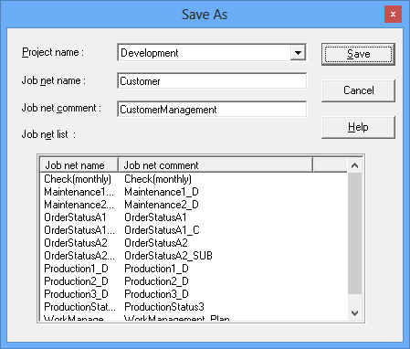 Select Save As from the File menu. The Save As window will appear. Specify the job net name and any job net comments, then click Save. The job net will be saved in the project.
