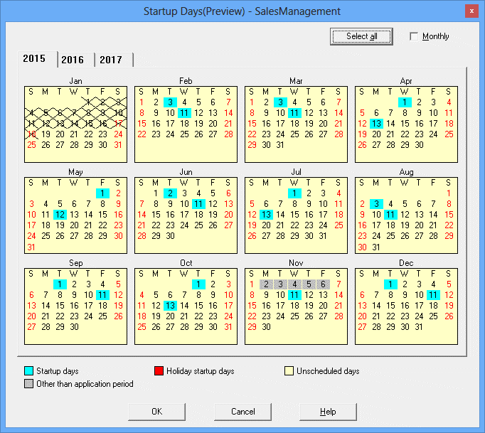 A preview of the startup day information that has been set up in the Startup days sheet is displayed in the Startup days (Preview) window. It is also possible to set an "exception day" (a non-standard manual change to the predefined pattern settings) by switching between startup days and unscheduled days in the Startup days (Preview) window.