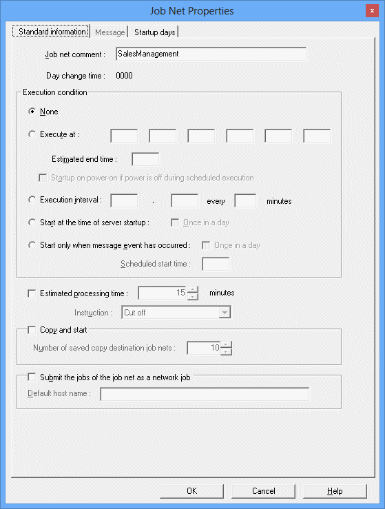 Specifies standard job net information including comments, execution conditions (None/Execute at/Execution interval/Start at the time of server startup/Start only when message event has occurred), host name submitting jobs to the job net, etc.