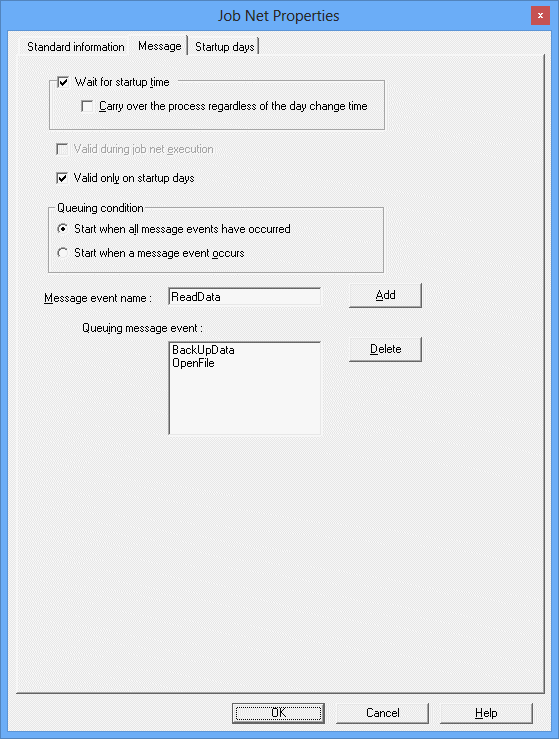 Wait for startup time can be specified in the Message sheet only if Execute at is specified in Execution condition for the job net and only one execution time (Once in a day) is specified. When this is specified, the job net starts only once a day even if message events occur several times. When Once in a day is specified for Start only when message event has occurred in Execution condition of the Standard information sheet, the job net starts only once a day when the first message event occurs.