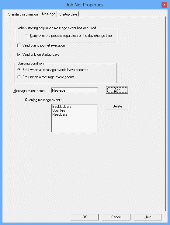 When Start only when message event has occurred has been specified in the Standard information sheet of the Job Net Properties window, set the message event in the following Message sheet: