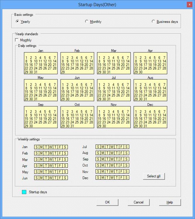 When this button is clicked, the information that forms the basis for the startup days ("yearly", "monthly", or "business days") is displayed automatically.