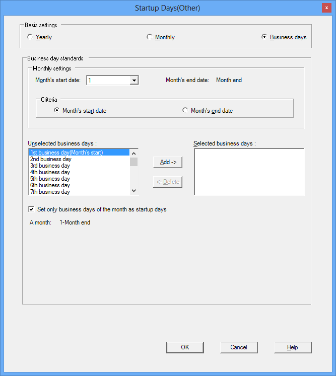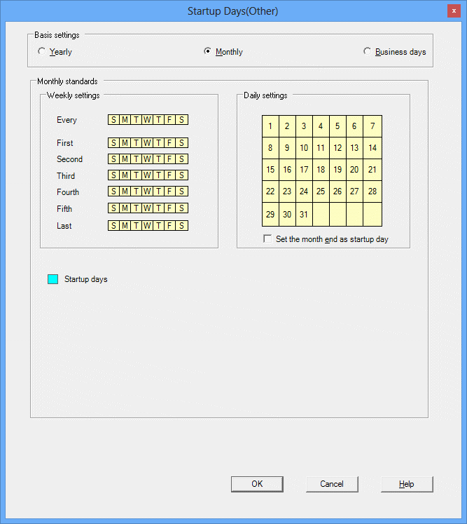 If this option is selected, the basis for specifying startup days will be patterns based on the day of the month, such as "x days from the first business day of the month" or "y days before the end of the month."