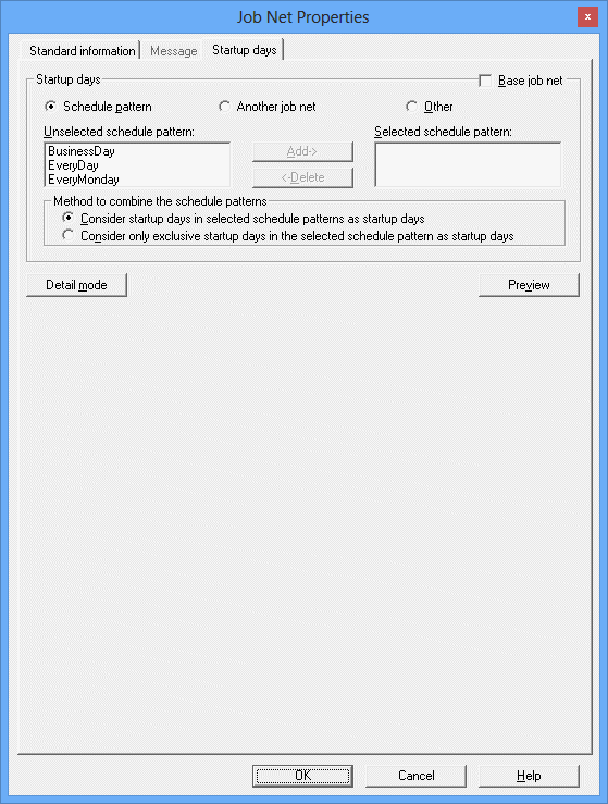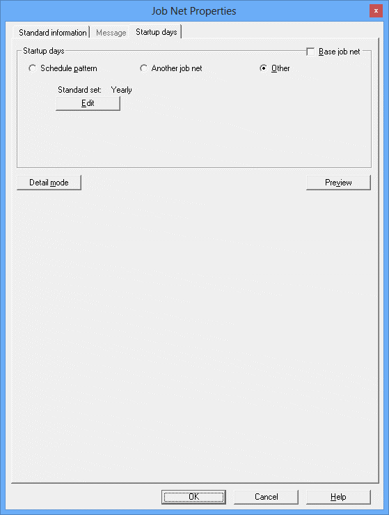 Defines basic job net execution schedules (i.e., startup days) when job nets start automatically on specific days. The detail mode windows can also be used to select which calendar to use, specify what to do if a startup day coincides with a holiday, and register information about the operating period.