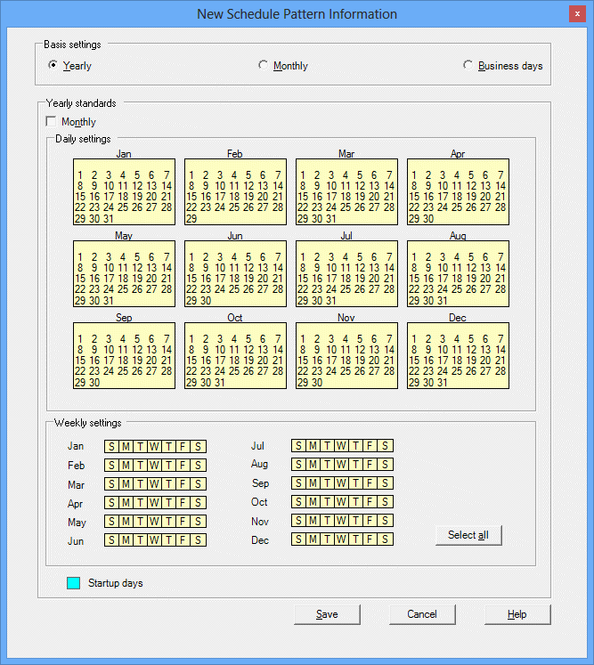 Registering a schedule pattern involves selecting the basis for the schedule pattern (yearly, monthly, or business days), and then specifying startup days and unscheduled days.