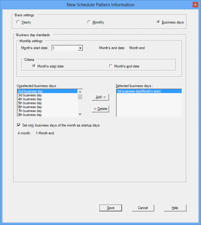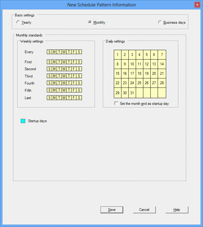 If this option is selected, the basis for specifying startup days will be patterns based on the day of the month, such as "x days from the first business day of the month" or "y days before the end of the month".