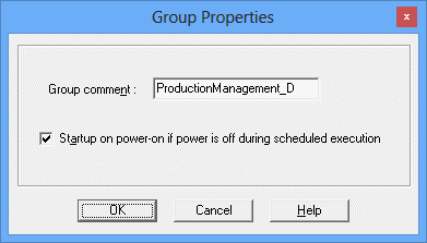 Register the group information (including the group comment and actions at power off) in the Group Properties window.