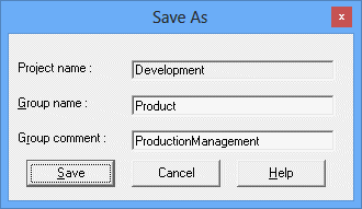 Click Save As from the File menu. When the Save As window appears, specify the group name and the group comment, then click Save. The group will be saved in the project.