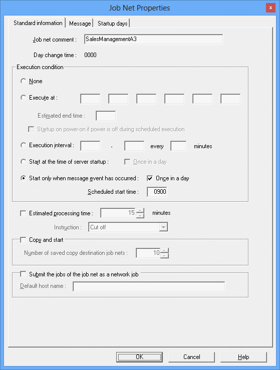The scheduled time can be set as follows for job nets with the execution condition of Start only when message event has occurred.