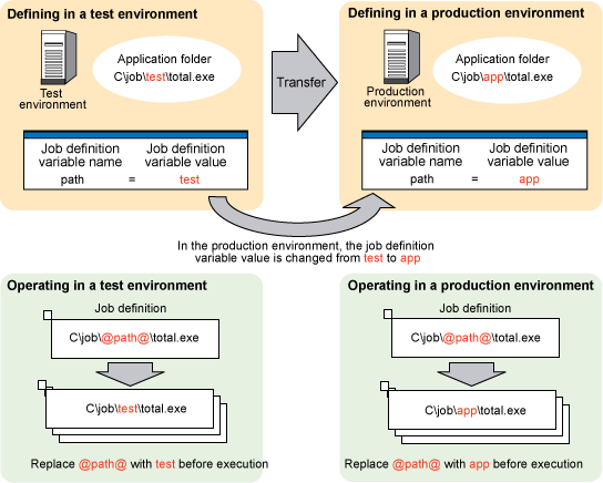 It is possible to define a job that uses job definition variables in advance so that when the job is executed, the values of the job definition variables can all be replaced at the same time. This makes it easy to replace path environment and other job definitions, thereby enabling assets to be transferred between systems in different operating environments.