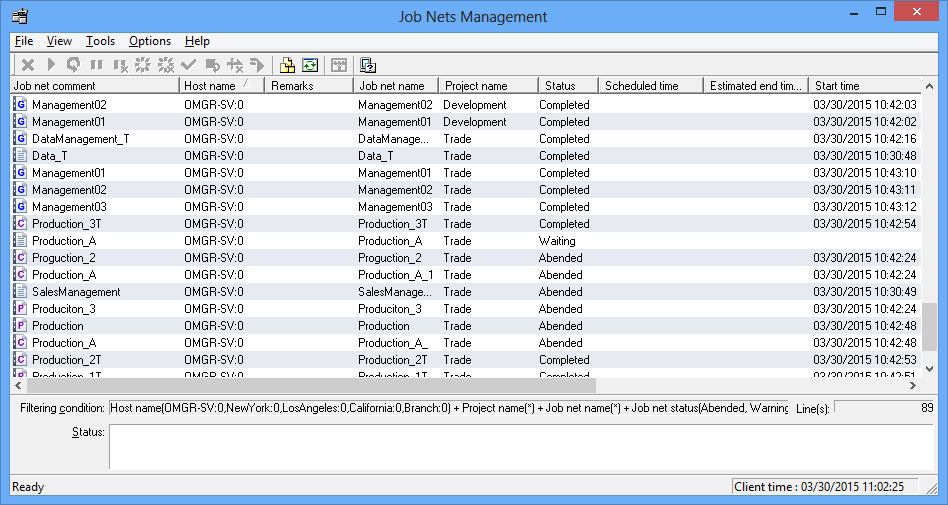 Clicking OK in the Filtering Conditions for Job Nets Management window displays the job nets filtered with the specified conditions in the Job Nets Management window.