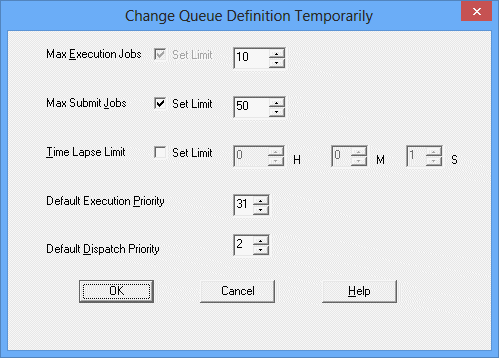 In the Change Queue Definition Temporarily dialog box, the definition items shown below can be temporarily changed in response to situations such as a job execution delay caused by the congestion of the executing queue. The attributes of the temporarily changed queue will be retained until the Job Execution Control is restarted in the initialization mode.