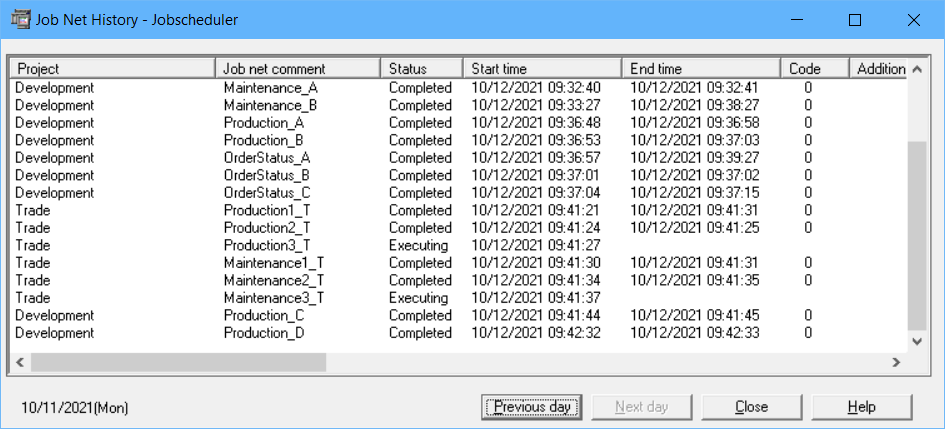 The following describes how to browse the job net execution result history. The history information in the log files (jobdb1.log/jobdb2.log/jobdb3.log) can be browsed in the Job Net History window. This window displays the execution result (Completed, Abended, etc.) and the completion code of the job net. The following describes the display methods and the display contents of the Job Net History window.